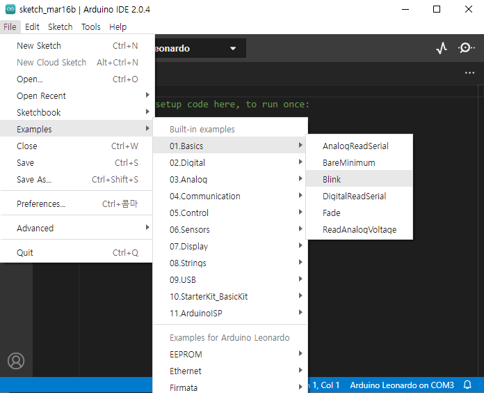 아두이노(Arduino) 샘플(예제)코드 실행하기 아두이노 IDE를 실행 한 뒤 File -> Examples -> 01.Basics -> Blink 를 선택한다. 그럼 아래와 같이 예제파일이 불러와 지는데 왼쪽 상단의 화살표를 클릭하거나 'Ctrl+U'를 누르면 컴파일 후 업로드가 된다. 업로드가 완료되면 다음과 같이 LED가 깜빡이는 것을 확인 할 수 있다. 만약 깜빡이지 않거나 IDE에 에러 메세지가 발생하면 설정한 컴포트가 맞는지, 모델이 정확한지 다시 확인해보자 이번에는 센서값을 읽어서 Serial 로 출력하는 예제를 실행해 보자 File -> Examples -> 01.Basics -> AnalogReadSerial 을 선택한다. 위의 예제와 마찬가지로 Upload를 실행하면 된다. 단 이 때 업로드중 에러가 발생할 경우 업로드 타이밍에 맞게.. 개발 관련/아두이노(Arduino) 2023.03.16