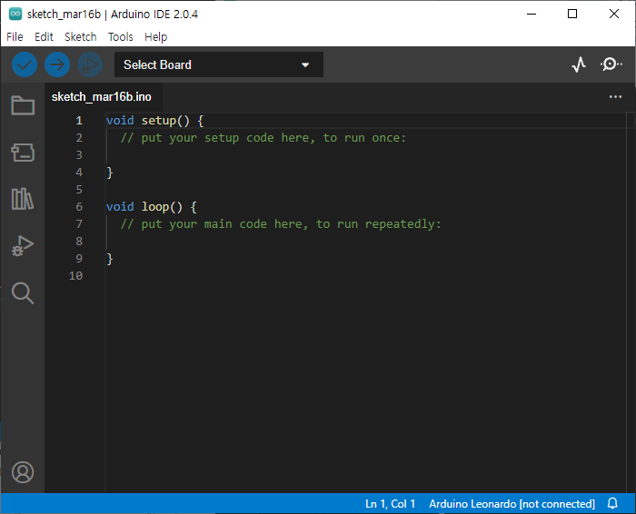 아두이노(Arduino) IDE 설정하기 설치한 아두이노 IDE를 실행하면 아래와 같은 화면이 나타난다. 아두이노를 PC에 연결하고 'Select Board'를 클릭하여 자신이 사용하는 보드를 선택하자. 오른쪽 하단에 해당 보드의 이름과 연결된 컴포트가 표시되면 잘 연결 된 것이다. 이번에는 IDE를 설정하기 위해 메뉴에서 File -> Preferences를 선택하거나 'Ctrl+,' (컨트롤 버튼을 누른 상태에서 컴마를 누른다)를 눌러 설정으로 이동하자 소스파일 저장시 매번 작업폴더로의 이동이 번거로워 기본위치를 작업폴더로 설정을 하였다. 아래 Theme의 경우 나와 같이 다크모드를 사용하고 싶은 경우 Theme에서 원하는 것을 선택하면 된다. 개발 관련/아두이노(Arduino) 2023.03.16