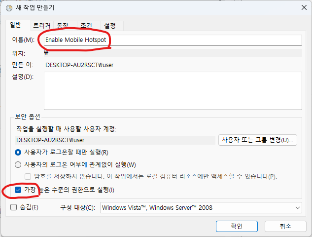 윈도우 부팅시 모바일 핫스팟 자동실행하기 1. PowerShell 스크립트 작성메모장을 열어 아래와 같이 입력 후 파일 이름을 "EnableMoblieHotspot.ps1"로 저장합니다.YourSSID와 YourPassword를 원하는 SSID와 비밀번호로 변경합니다.netsh wlan set hostednetwork mode=allow ssid=YourSSID key=YourPasswordnetsh wlan start hostednetwork 2. 작업 스케줄러 설정시작 메뉴에서 "작업 스케줄러"를 검색하여 열고 작업 만들기를 클릭합니다. 일반탭에서 이름을 입력하고 "가장 높은 수준의 권한으로 실행" 옵션을 선택합니다.트리거탭에서 새로 만들기를 클릭합니다.작업 시작 항목을 "시작할 때"로 선택 후 확인을 클릭합니다.동작탭에서 새로 만들기를 클.. 윈도우 2024.06.17
